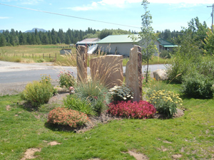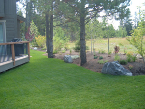 Water efficient (xeriscape style) native grass "Sheeps Fescue" which only needs mowing 2-4 times per season bordered by Retainer Walled Bed rehabilitated with low profile bushes and native perennials to allow winter snow storage without damaging vegetation |