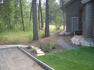 River rock drain rock to catch roof drip edge storm water adjacent to gravel pathway bordered by native perennial garden |